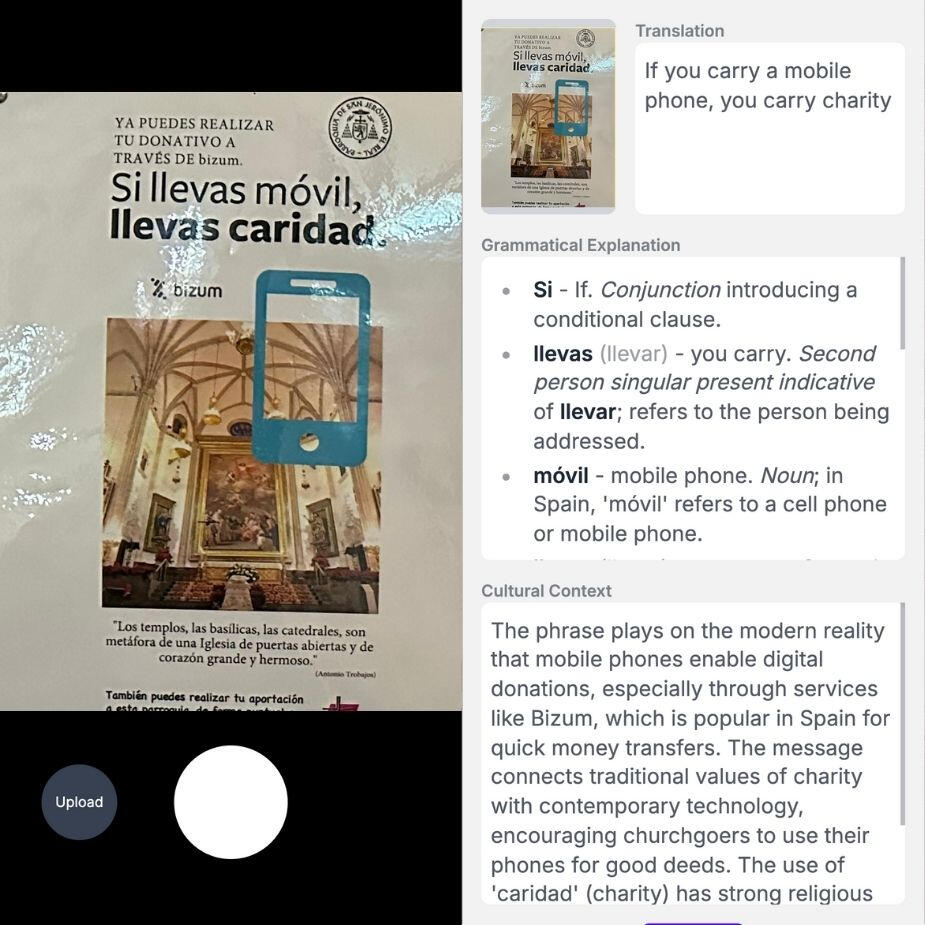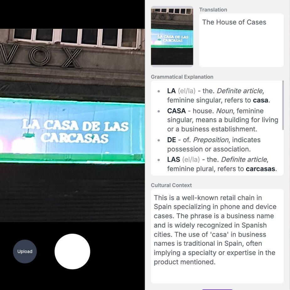 Snap any Spanish text and get a plain-English explanation of why it’s written that way — meaning, grammar, and cultural context.
